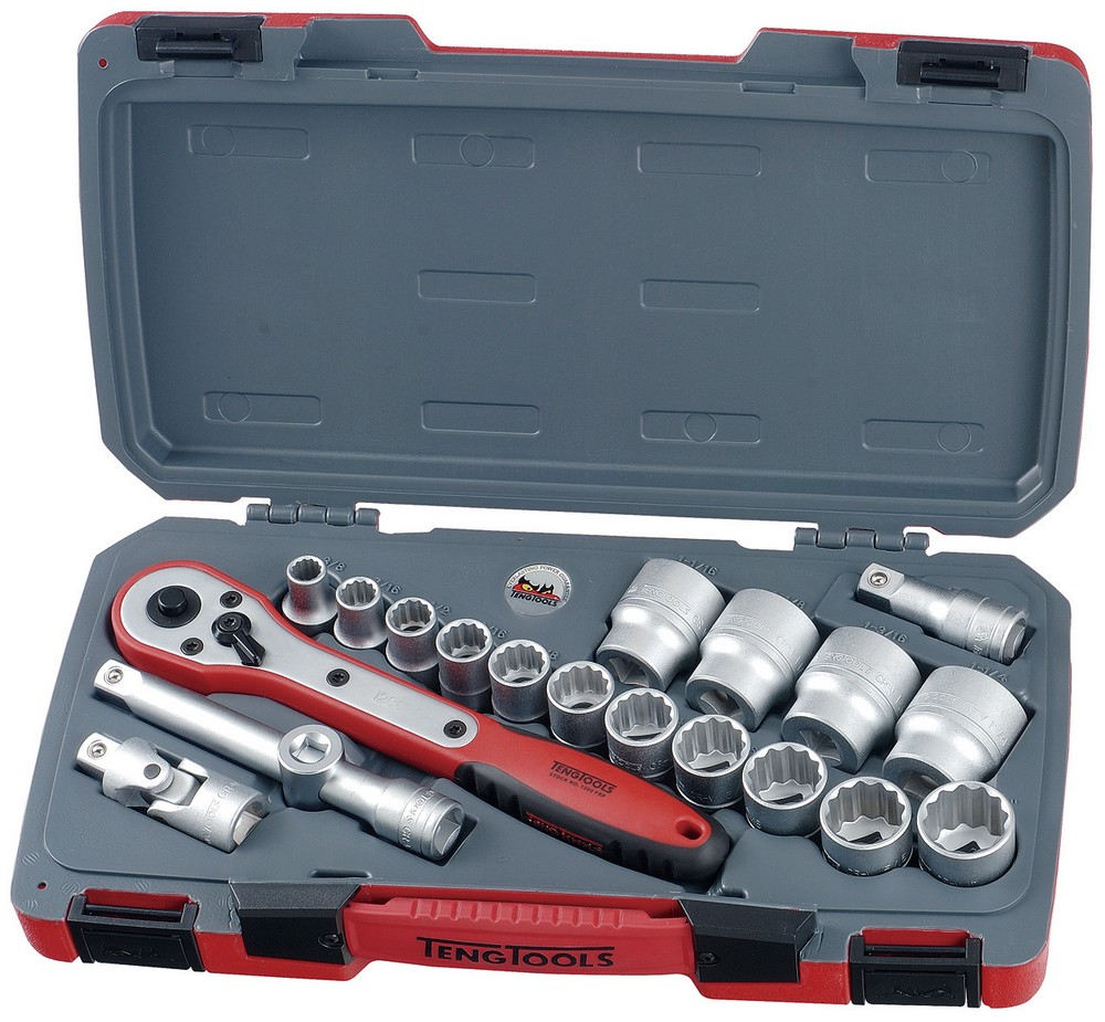 Linea Teng Tools TC TRAYS - 15 pezzi Assortimento di 15 chiavi a bussola in pollici con attacco quadro 1/2" Bussole con bocca poligonale - In acciaio al Cromo Vanadio - Esecuzione satinata Misure: 3/8", 7/16", 1/2", 9/16", 5/8", 11/16", 3/4", 13/16", 7/8", 15/16", 1", 1"1/16, 1"1/8, 1"3/16, 1"1/4 In contenitore di plastica dura (ABS) sagomato internamente per il posizionamento degli utensili adattabile a tutte le cassettiere ed i carrelli porta utensili Teng Tools Utilizzabile come singolo assortimento oppure combinabile con le altre cassette della linea TC TRAYS per creare il proprio assortimento personalizzato