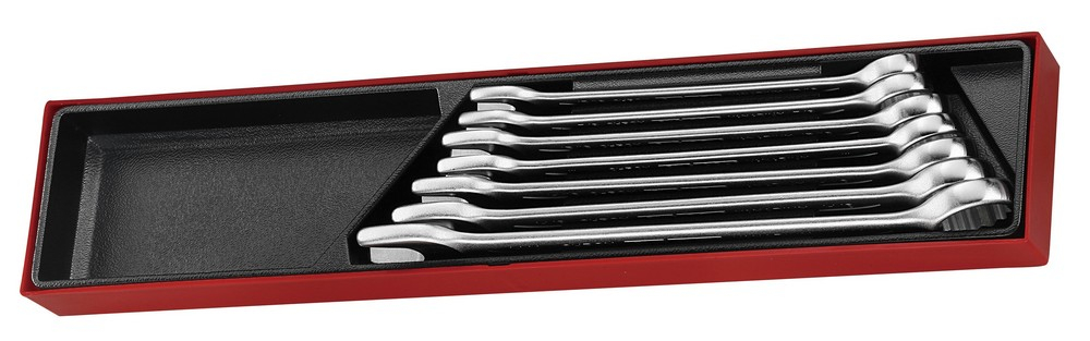 Linea Teng Tools TC TRAYS Assortimento di 8 chiavi combinate in pollici da 5/16" a 3/4" in acciaio al Cromo Vanadio Esecuzione satinata Testa lucida Forchetta con angolo 15° Serie standard DIN 3113A Misure: 5/16", 3/8", 7/16", 1/2", 9/16", 5/8", 11/16", 3/4" In contenitore di plastica dura (ABS) sagomato internamente per il posizionamento degli utensili adattabile a tutte le cassettiere ed i carrelli porta utensili Teng Tools Utilizzabile come singolo assortimento oppure combinabile con le altre cassette della linea TC TRAYS per creare il proprio assortimento personalizzato