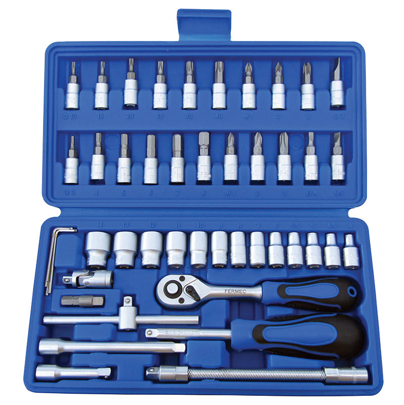 Assortimento di chiavi a bussola in pollici e accessori con attacco quadro 1/2" - 20 pezzi In cassetta brevettata di plastica dura con piedini di appoggio in gomma antisdrucciolo ed apertura a scatto 1 cricchetto reversibile 1 giunto universale 2 prolunghe mm 63.5 e 150 1 raccordo di riduzione 1/2"-3/8" 15 bussole poligonali in pollici con dimensione 3/8", 7/16", 1/2", 9/16", 5/8", 11/16", 3/4", 13/16", 7/8", 15/16", 1", 1"1/16, 1"1/8, 1"3/16, 1"1/4 Dimensioni: Mm 369x198x62 Peso: Kg 3.00