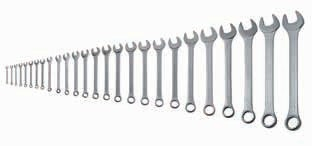Assortimento di 18 chiavi combinate professionali con profilo corpo sottile e spessore anello ridotto Realizzate in acciaio al cromo-vanadio Finitura satinata con teste lucide Misure mm 6, 7, 8, 9, 10, 11, 12, 13, 14,15,16, 17, 19, 22, 24, 27, 30, 32 Norme UNI 6741, ISO 7738, DIN 3113