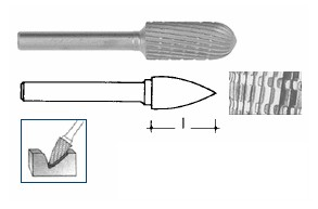 Fresa rotativa professionale in metallo duro con forma a punta Taglio T1 bastardo per acciaio, acciaio temperato, saldatura, ghisa e materiali metallici in genere Ottimo rendimento Buona finitura Velocità consigliata: 400-600 m/min Dimensioni fresa (Øxlunghezza) mm 16x30 Lunghezza totale mm 70 Codolo Ø mm 6 Confezionata singolarmente