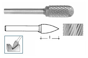 Fresa rotativa professionale in metallo duro con forma a punta Taglio T1 bastardo per acciaio, acciaio temperato, saldatura, ghisa e materiali metallici in genere Ottimo rendimento Buona finitura Velocità consigliata: 400-600 m/min Dimensioni fresa (Øxlunghezza) mm 16x30 Lunghezza totale mm 70 Codolo Ø mm 6 Confezionata singolarmente