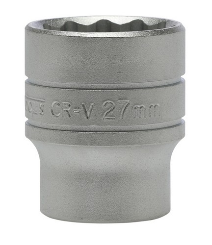 Set di 27 bussole ed accessori con attacco quadro da 1/2" In valigetta di plastica antiurto sagomata Conforme a norme DIN 1 cricchetto reversibile da 72 denti 2 prolunghe testa sferica mm 125 e 250 1 quadro scorrevole 1 snodo cardanico 2 bussole per candele mm 16 e 21 20 bussole esagonali mm 8, 9, 10, 11, 12, 13, 14, 15, 16, 17, 18, 19, 20, 21, 22, 23, 24, 27, 30, 32