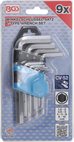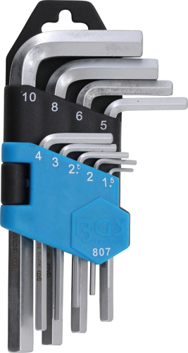 Assortimento di 9 chiavi maschio esagonale con misure in pollici da 5/64" a 3/8" In acciaio al cromo vanadio Brunite Modello combinato esagonale/a sfera "ball end" per lavorare anche con la chiave inclinata fino a 30° Misure 5/64", 3/32", 1/8", 5/32", 3/16", 7/32", 1/4", 5/16", 3/8" Fornite in supporto di plastica pieghevole