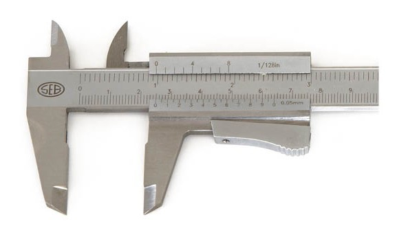 Calibro monoblocco a corsoio inox cromato opaco Capacità di misura utile mm 150 Lunghezza becchi mm 45 Precisione secondo norme DIN 862 Asta graduata in millimetri e pollici Incisioni fotoincise chimicamente annerite Nonio allungato 1/20 di mm e 1/128 di pollice Doppia tabella per le filettature a passo Whitworth e S.I. Asta di profondità da 3,5 x 1 mm con smusso terminale per piccoli fori Bloccaggio a molla con pulsante Becchi temperati, rettificati e lappati Punte a coltello per interni Superfici di lettura satinate opache Facilità di lettura per assenza di riflessi 4 funzioni: esterni, interni, profondità, spallamenti Confezione in astuccio rigido