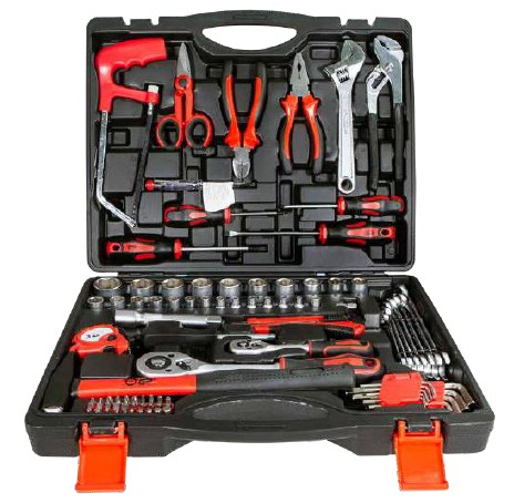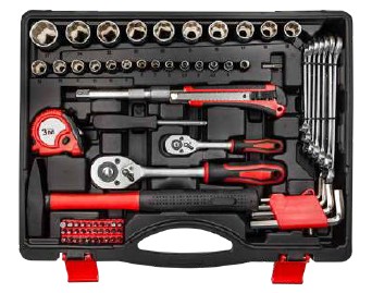Assortimento completo di chiavi a bussola e utensili manuali in valigetta Composto da un totale di 127 pezzi Bussole in acciaio al Cromo Vanadio con attacco quadro 1/4" e 1/2" Set inserti 1/4" Bussole per candele Accessori per chiavi a bussola Cricchetti da 1/4" e da 1/2" a 45 denti con corpo in acciaio e sezione rettilinea Completano l'assortimento gli utensili manuali: pinzetteria varia, giraviti assortiti, pinza per capicorda, martello, archetto per seghetto, livella, flessometro, forbici da elettricista e 8 chiavi combinate Valigia in alluminio Dimensioni mm 470x150x360