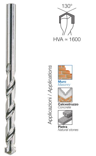Assortimento di punte foratutto universali ad alte prestazioni per il taglio di tutti i materiali In astuccio di plastica Composto da 4 punte Ø 4x75, 5x85, 6x100, 8x120 mm Punte elicoidali con codolo cilindrico in metallo duro HVA 1650 Placchetta affilata con diamante con geometria innovativa Corpo rettificato con scarico ad “U” In acciaio legato HRC 40÷50 Saldobrasatura a 1100° C Taglio preciso e senza sbavature a rotazione in metalli, ceramica e in tutti i materiali da edilizia durissimi (sino 8° Mohs) e a rotopercussione in marmo, granito, pietre DIN 8039 - ISO 5468