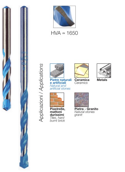Assortimento di punte foratutto universali ad alte prestazioni per il taglio di tutti i materiali In astuccio di plastica Composto da 4 punte Ø 4x75, 5x85, 6x100, 8x120 mm Punte elicoidali con codolo cilindrico in metallo duro HVA 1650 Placchetta affilata con diamante con geometria innovativa Corpo rettificato con scarico ad “U” In acciaio legato HRC 40÷50 Saldobrasatura a 1100° C Taglio preciso e senza sbavature a rotazione in metalli, ceramica e in tutti i materiali da edilizia durissimi (sino 8° Mohs) e a rotopercussione in marmo, granito, pietre DIN 8039 - ISO 5468