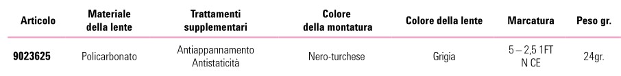 Occhiale di sicurezza bifocale con supplemento di lettura integrato nella parte inferiore della lente protettiva che offre una visibilità molto nitida anche da vicino, permettendo così di non sostituire gli occhiali per leggere e mantenendo quindi l’occhio sempre protetto Supplemento di lettura con diottria +1,50 Fascia opzionale intercambiabile con le stanghette in dotazione per una migliore aderenza in caso di lavorazioni in cui venga mossa molta polvere Morbido appoggio sul viso per ridurre il rischio di lesioni Disegno sportivo Morbido appoggio sul naso Lente protettiva di grande dimensione per un ampio campo visivo Copertura oculare molto buona Lenti trasparenti in policarbonato Custodia in microfibra compresa nella confezione Protezione UV: 100% Peso: 34 grammi Montatura: Nero/Turchese Stanghette: Easy Fit Soft–gommate antiscivolo o fascia elastica Protezione AF - AS: rivestimento antigraffio interno/esterno lente, antiappannamento e antistatico Conforme EN 166 CE Marcatura Montatura: GA 166 F CE Marcatura Lenti: 2C - 1,2 GA 1 F N CE
