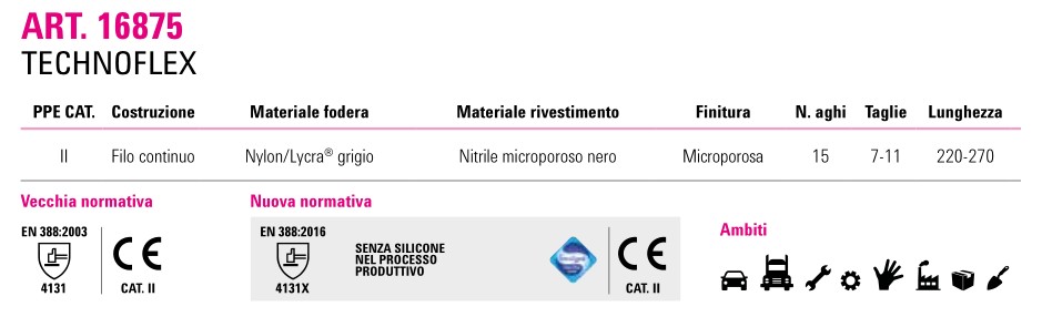 Guanto traspirante che incorpora micropunti in rilievo che ne esaltano le proprietà di presa in applicazioni ripetitive e di precisione, aumentandone la resistenza all’abrasione e garantendo una durata notevolmente superiore ai guanti della stessa categoria Le innovative forme utilizzate simulando la mano a riposo riducono l’affaticamento e consentono la perfetta aderenza alla mano aumentandone la sensibilità tattile La spalmatura che prosegue oltre le nocche, pur lasciando il dorso areato, garantisce un’ulteriore resistenza all’abrasione Adatto per manipolare pezzi caldi in ambiente asciutto (max 100°C per 15 secondi) Consigliato per utilizzo nei settori: automobilistico, trasporti, meccanico, manutenzione, manifattura, industria, logistica e magazzino ed edilizia Supporto in nylon-Spandex elasticizzato Supporto in maglia senza cuciture (filo continuo) Rivestimento in nitrile microporoso traspirante Palmo puntinato per un’alta resistenza all’usura ed un grip inimitabile Silicon free Dorso areato Polso elasticizzato Colore: Grigio/Nero Taglie 9 e 10 Confezionamento: pacchetto da 12 paia CE Cat II - EN 388:2016 4131X - EN 407:2004 X1XXXX A richiesta fornibili anche le taglie 6, 7, 8 e 11 Articolo Tipo Colore 16-845 Dorso Areato Polso Elasticizzato Palmo Puntinato Grigio/Nero