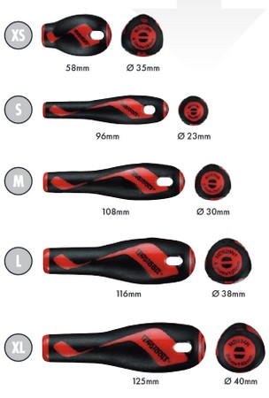 Giraviti professionali per viti a intaglio Linea Ergofort Lame in acciaio speciale al silicio tipo SVCM Impugnatura ergonomica bimateriale Codici e simboli identificativi di taglio e modello riportati sull'estremità del manico UNI 10562 - ISO 2380 - DIN 5264 A richiesta sono fornibili anche le dimensioni non disponbili Articolo Misura mm Lunghezza mm 300.T2,5x50 2.5 x 50 120 300.T2,5x75 2.5 x 75 145 300.T3x75 3 x 75 145 300.T3x100 3 x 100 170 300.T3,5x75 3.5 x 75 145 300.T3,5x100 3.5 x 100 170 300.T4x100 4 x 100 170 300.T4x125 4 x 125 195 300.T4x150 4 x 150 220 300.T5,5x100 5.5 x 100 200 300.T5,5x125 5.5 x 125 225 300.T5,5x150 5.5 x 150 250 300.T5,5x200 5.5 x 200 300 300.T6,5x125 6.5 x 125 235 300.T6,5x150 6.5 x 150 260 300.T6,5x200 6.5 x 200 310 300.T8x150 8 x 150 272 300.T8x175 8 x 175 297