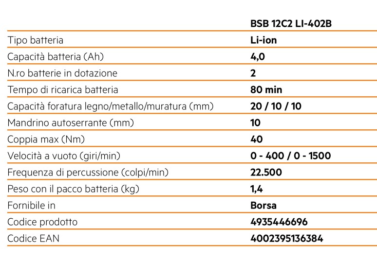 Trapano avvitatore a percussione a batteria ad alte prestazioni della famiglia AEG PRO18V SubCompact La gamma SubCompact garantisce la completa compatibilità con tutti gli utensili della gamma PRO18V Compatto e potente, in grado di erogare fino a 110 Nm di coppia Batteria al litio 18V 4Ah 2 velocità: 0 - 500 / 0 - 2100 giri/min Motore senza spazzole Brushless più compatto e con fino al 50% di autonomia in più rispetto al motore con le spazzole tradizionale Mandrino autoserrante 13 mm in metallo Fino a 31.500 colpi al minuto in modalità percussione 24 regolazioni di frizione per un controllo efficace in avvitatura Progettato per la migliore ergonomia e il massimo comfort dell'utilizzatore LED per illuminare l’area di lavoro Alimentazione tramite batteria PRO Lithium Ion con tripla protezione, per la massima durata sia dell’utensile che della batteria Capacità di foratura nel legno mm 65 Capacità di foratura nel metallo mm 13 Capacità di foratura nella muratura mm 13 Gli utensili della nuova gamma AEG SubCompact sono fino al 30% più compatti e garantiscono la stessa eccezionale autonomia e potenza della gamma PRO18V in dimensioni ridotte Rivoluzionario sistema a batteria agli ioni di litio PRO18V La tecnologia AEG Lithium-Ion garantisce la massima protezione dell'utensile e della batteria grazie all'impiego di tre innovativi sistemi di protezione: monitoraggio cella, protezione elettronica e protezione termica Fornito in valigetta completo di 2 batterie 18V 4.0 Ah e caricabatterie Scheda completa