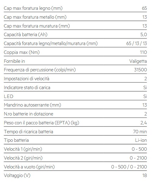 Trapano a percussione elettrico molto potente ad alte prestazioni Fornito in kit con 3 serie di punte (legno, metallo, muratura) 2 velocità Sistema di antivibrazione (AVS) per un miglior comfort di utilizzo Scatola degli ingranaggi in metallo per garantire la massima durata Mandrino autoserrante in metallo da 13 mm Impugnatura Softgrip per una presa perfetta e una comoda maneggevolezza Possibilità di blocco in funzione dell’interruttore Frizione di sicurezza per proteggere sia l’utilizzatore che l’utensile Possibilità di esclusione della percussione Fornito con impugnatura addizionale e astina di profondità Capacità di foratura nel legno mm 40 Capacità di foratura nel metallo mm 13 Capacità di foratura nella muratura mm 24 Capacità di foratura nel calcestruzzo mm 22 Fornito in valigetta completo di impugnatura laterale, astina di profondità e 3 serie di punte per legno, ferro e muro Scheda completa