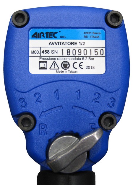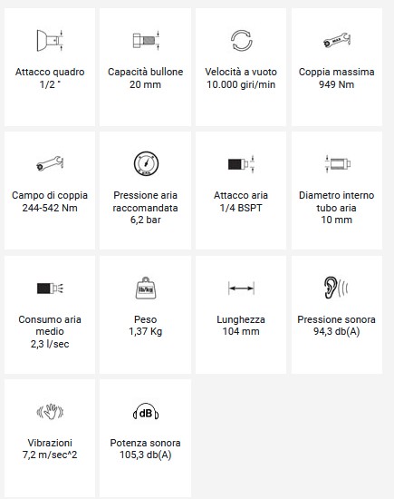 Avvitatore ad impulsi Hi-Tech professionale Attacco quadro 1/2" Dotato del nuovo sistema di battuta Mechoneer Avvitatore notevolmente ergonomico e potente Scarico dell’aria nell’impugnatura Regolatore/invertitore nel pulsante, 3 posizioni (2 in avvitamento) Pulsante brevettato che combina il comando avvitatura - svitatura - gestione della potenza e permette di gestire le regolazioni con una mano Impugnatura ergonomica Coppia di sbloccaggio del dado in svitamento 1.850 Nm Coppia massima Nm 1230 Campo di coppia Nm 130-650 Velocità a vuoto 7500 giri/minuto Il sistema MECHONEER è un meccanismo IBRIDO che combina i sistemi di battuta TWIN HAMMER e PIN-LESS, con meno parti mobili, riducendo le vibrazioni e l’usura: la parte posteriore dell'albero è collegata da un alberino secondario allo stelo del rotore, garantendo concentricità e allineamento tra rotore, coperchio e cilindro, riducendo vibrazioni ed usura ed eliminando perdite d’aria interne del motore, che potrebbero causare perdite di potenza Scheda tecnica Modello 355 Articolo 12102055 Attacco quadro 1/2" Capacità bullone 22 mm Coppia massima 1230 nm Coppia di lavoro 130-650 nm Velocità a vuoto 7.500 rpm Peso 2,0 kg Lunghezza 170 mm Pressione aria 6,2 bar Consumo aria medio 2,7 l/sec Pressione sonora 84,7 db(A) Potenza sonora 95,7 db(A) Vibrazioni 6,5 m/s2 Ø interno tubo 10 mm Attacco aria 1/4" BSP