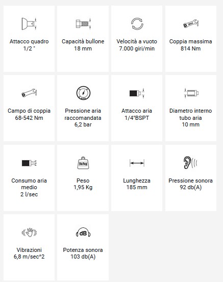 Avvitatore ad impulsi Hi-Tech professionale Attacco quadro 1/2" Dotato del nuovo sistema di battuta Mechoneer Avvitatore notevolmente ergonomico e potente Scarico dell’aria nell’impugnatura Regolatore/invertitore nel pulsante, 3 posizioni (2 in avvitamento) Pulsante brevettato che combina il comando avvitatura - svitatura - gestione della potenza e permette di gestire le regolazioni con una mano Impugnatura ergonomica Coppia di sbloccaggio del dado in svitamento 1.850 Nm Coppia massima Nm 1230 Campo di coppia Nm 130-650 Velocità a vuoto 7500 giri/minuto Il sistema MECHONEER è un meccanismo IBRIDO che combina i sistemi di battuta TWIN HAMMER e PIN-LESS, con meno parti mobili, riducendo le vibrazioni e l’usura: la parte posteriore dell'albero è collegata da un alberino secondario allo stelo del rotore, garantendo concentricità e allineamento tra rotore, coperchio e cilindro, riducendo vibrazioni ed usura ed eliminando perdite d’aria interne del motore, che potrebbero causare perdite di potenza Scheda tecnica Modello 355 Articolo 12102055 Attacco quadro 1/2" Capacità bullone 22 mm Coppia massima 1230 nm Coppia di lavoro 130-650 nm Velocità a vuoto 7.500 rpm Peso 2,0 kg Lunghezza 170 mm Pressione aria 6,2 bar Consumo aria medio 2,7 l/sec Pressione sonora 84,7 db(A) Potenza sonora 95,7 db(A) Vibrazioni 6,5 m/s2 Ø interno tubo 10 mm Attacco aria 1/4" BSP