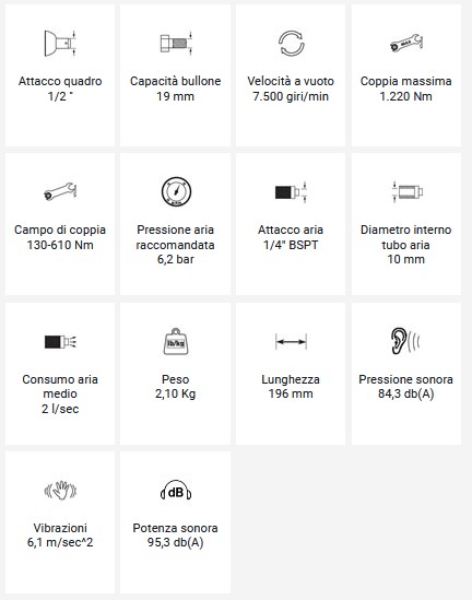 Avvitatore ad impulsi Hi-Tech professionale Attacco quadro 1/2" Dotato del nuovo sistema di battuta Mechoneer Avvitatore notevolmente ergonomico e potente Scarico dell’aria nell’impugnatura Regolatore/invertitore nel pulsante, 3 posizioni (2 in avvitamento) Pulsante brevettato che combina il comando avvitatura - svitatura - gestione della potenza e permette di gestire le regolazioni con una mano Impugnatura ergonomica Coppia di sbloccaggio del dado in svitamento 1.850 Nm Coppia massima Nm 1230 Campo di coppia Nm 130-650 Velocità a vuoto 7500 giri/minuto Il sistema MECHONEER è un meccanismo IBRIDO che combina i sistemi di battuta TWIN HAMMER e PIN-LESS, con meno parti mobili, riducendo le vibrazioni e l’usura: la parte posteriore dell'albero è collegata da un alberino secondario allo stelo del rotore, garantendo concentricità e allineamento tra rotore, coperchio e cilindro, riducendo vibrazioni ed usura ed eliminando perdite d’aria interne del motore, che potrebbero causare perdite di potenza Scheda tecnica Modello 355 Articolo 12102055 Attacco quadro 1/2" Capacità bullone 22 mm Coppia massima 1230 nm Coppia di lavoro 130-650 nm Velocità a vuoto 7.500 rpm Peso 2,0 kg Lunghezza 170 mm Pressione aria 6,2 bar Consumo aria medio 2,7 l/sec Pressione sonora 84,7 db(A) Potenza sonora 95,7 db(A) Vibrazioni 6,5 m/s2 Ø interno tubo 10 mm Attacco aria 1/4" BSP