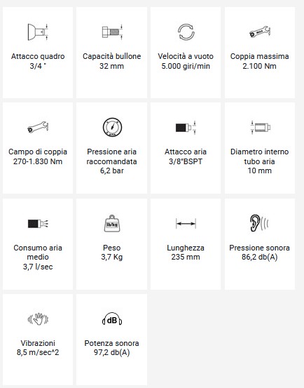 Avvitatore ad impulsi professionale molto potente Attacco quadro 1/2" Raggiunge una coppia di sbloccaggio del dado di 1830 Nm Sistema a doppia massa battente "Twin Hammer" Scarico dell'aria nell'impugnatura Regolatore a 3 posizioni in avvitamento Attacco aria girevole Coppia massima Nm 1220 Campo di coppia Nm 130-610 Velocità a vuoto 7500 giri/minuto Scheda tecnica Modello 333 Articolo 12102050 Attacco quadro 1/2" Capacità bullone 22 mm Coppia massima 1220 nm Coppia di lavoro 130-610 nm Velocità a vuoto 7.500 rpm Peso 2,10 kg Lunghezza 200 mm Pressione aria 6,2 bar Consumo aria medio 2,0 l/sec Pressione sonora 84,3 db(A) Potenza sonora 95,3 db(A) Vibrazioni 6,1 m/s2 Ø interno tubo 10 mm Attacco aria 1/4" BSP