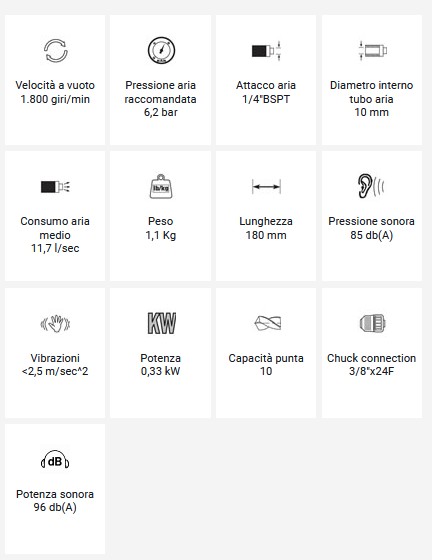 Trapano ad aria compressa Mandrino autoserrante in composito per punte da 1 a 10 mm Scarico posteriore Potenza 0.35 Kw Velocità a vuoto 2500 giri al minuto Scheda tecnica Modello 478/A Articolo 15010010 Potenza 0.35 Kw Capacità punta 10 mm Attacco mandrino 3/8" x 24 F Velocità a vuoto 2.500 rpm Peso 1,15 kg Lunghezza 173 mm Pressione aria 6,2 bar Consumo aria medio 11,7 l/sec Pressione sonora 82 db(A) Potenza sonora 100 db(A) Vibrazioni < 2,5 m/s2 Ø interno tubo 10 mm Attacco aria 1/4" BSPT