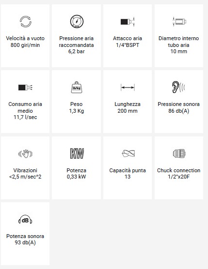 Trapano ad aria compressa Mandrino autoserrante in composito per punte da 1 a 10 mm Scarico posteriore Potenza 0.35 Kw Velocità a vuoto 2500 giri al minuto Scheda tecnica Modello 478/A Articolo 15010010 Potenza 0.35 Kw Capacità punta 10 mm Attacco mandrino 3/8" x 24 F Velocità a vuoto 2.500 rpm Peso 1,15 kg Lunghezza 173 mm Pressione aria 6,2 bar Consumo aria medio 11,7 l/sec Pressione sonora 82 db(A) Potenza sonora 100 db(A) Vibrazioni < 2,5 m/s2 Ø interno tubo 10 mm Attacco aria 1/4" BSPT