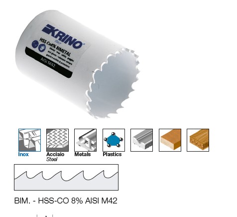 Assortimento di frese perforatrici a tazza professionali in cassetta di ABS antiurto Composto da 8 frese Ø mm 16, 18, 20, 22, 25, 30, 32, 35 Linea Krino Professional Frese perforatrici a tazza in HSS-G interamente rettificate per forare lamiere in acciaio, ferro, leghe leggere, tutti materiali metallici e plastica dura Innovativo disegno dei denti e taglio laterale: migliore scarico dei trucioli con grande rendimento del taglio R ≤ 800 N/mm2 HRC = 64 Dentatura ricavata interamente di rettifica Taglio laterale rompitruciolo Molla di espulsione del dischetto Profondità di foratura sino a 5 mm Grande rendimento, precisione di foratura nel taglio anche profondo di tutte le lamiere in acciaio, leghe leggere, materiali metallici in genere Riaffilabili