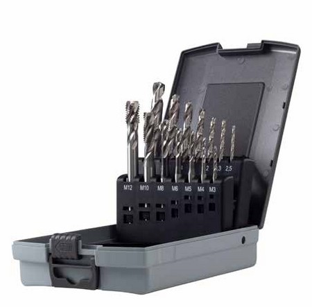 Serie di maschi a macchina M 3-12 + punte di preforo in acciaio super rapido HSS-G FILETTATURA METRICA A PASSO GROSSO M 14 pezzi Composto da 7 maschi a macchina con scanalature dritte per fori passanti M 3, 4, 5, 6, 8, 10, 12 + 7 punte per prefori di maschiatura Ø 2.5, 3.3, 4.2, 5, 6.8, 8.5, 10.2 mm Imbocco corretto DIN 371/B DIN 376/B ISO 2/6H Gambo rinforzato Per fori passanti in acciai con R≤700 N/mm2, ghisa, metalli non ferrosi a truciolo lungo Punte in HSS-G con gambo cilindrico Linea Krino Industrial Astuccio in ABS antiurto