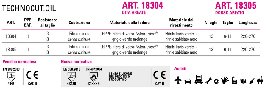 Guanto antinfortunistico antitaglio con supporto in fibre miste ad alta tenacità (HPPE, fibra di vetro incapsulata, nylon, Lycra) elasticizzato senza cuciture (filo continuo) che offre anche protezione dal calore da contatto fino a 100° Ottimo mix comfort, destrezza e grip anche in condizioni gravose: la doppia spalmatura nitrilica garantisce comfort, resistenza ed idrorepellenza di liquidi, oli, grassi e polveri; la finitura sabbiata nera aumenta il grip ed il comfort anche in condizioni gravose Il rinforzo applicato tra pollice e indice migliora la resistenza al taglio e prolunga la durata del guanto in una zona tendenzialmente debole Particolarmente indicato per lavorazioni in ambienti bagnati o oleosi dove sia indispensabile trovare un guanto molto strutturato, che possa essere utilizzato anche a contatto con pezzi caldi e taglienti Le innovative forme utilizzate simulando la mano a riposo riducono l’affaticamento e consentono la perfetta aderenza alla mano aumentandone la sensibilità tattile Consigliato per utilizzo nei settori: aerospaziale, automobilistico, trasporti, meccanica, manutenzione, manifattura, industria, logistica e magazzino, edilizia e petrolchimico Materiale fodera: HPPE-Fibre di vetro-Nylon-Lycra® grigio-verde melange Materiale rivestimento: Nitrile liscio verde + nitrile sabbiato nero Dita areate per aumentare comfort e traspirabilità Polso elasticizzato Supporto 13 aghi Resistenza al taglio 3 (B) Colore: Grigio melange/Verde-Nero Taglie 9 e 10 Confezionamento: pacchetto da 12 paia CE Cat II - EN 388:2016 4X43B - EN 407:2004 X1XXXX A richiesta fornibili anche le taglie 6, 7, 8 e 11 Articolo Tipo Colore 18-304 Dita areate Polso Elasticizzato Resistenza taglio 3 (B) Grigio/Verde/Nero