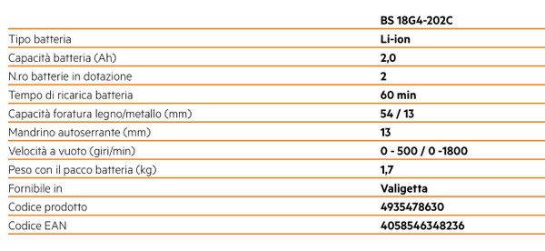 Trapano avvitatore a percussione a batteria ad alte prestazioni della famiglia AEG PRO18V SubCompact La gamma SubCompact garantisce la completa compatibilità con tutti gli utensili della gamma PRO18V Compatto e potente, in grado di erogare fino a 65 Nm di coppia Design SubCompact per la massima produttività e la migliore ergonomia Solo 1.3 Kg di peso con batteria 2.0Ah Lunghezza totale di soli 165 mm Batteria al litio 18V 2Ah 2 velocità: 0 - 450 / 0 - 1750 giri/min Motore senza spazzole Brushless più compatto e con fino al 50% di autonomia in più rispetto al motore con le spazzole tradizionale Mandrino 13 mm completamente in metallo Fino a 26.000 colpi al minuto per foratura su muratura 24 regolazioni di frizione per un controllo efficace in avvitatura Progettato per la migliore ergonomia e il massimo comfort dell'utilizzatore LED per illuminare l’area di lavoro Alimentazione tramite batteria PRO Lithium Ion con tripla protezione, per la massima durata sia dell’utensile che della batteria Capacità di foratura nel legno mm 40 Capacità di foratura nel metallo mm 13 Capacità di foratura nella muratura mm 13 Gli utensili della nuova gamma AEG SubCompact sono fino al 30% più compatti e garantiscono la stessa eccezionale autonomia e potenza della gamma PRO18V in dimensioni ridotte Rivoluzionario sistema a batteria agli ioni di litio PRO18V La tecnologia AEG Lithium-Ion garantisce la massima protezione dell'utensile e della batteria grazie all'impiego di tre innovativi sistemi di protezione: monitoraggio cella, protezione elettronica e protezione termica Fornito in valigetta completo di 2 batterie 18V 2.0 Ah e caricabatterie Scheda completa