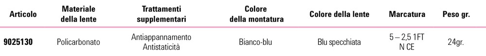 Nuova linea di occhiali antinfortunistici che punta a disegnare un nuovo standard di sicurezza, in cui comfort ed estetica si coniugano con una protezione meccanica di alta qualità per ciò che concerne la protezione della vista Occhiale sportivo altamente flessibile, robusto e confortevole che rimane sul viso senza esercitare pressione Bordo interno e supporto nasale completamente gommati per aumentare la resistenza allo scivolamento Profilo di gomma nella parte alta della montatura per protezione dall'ingresso di corpi estranei dall’alto Elevata curvatura della lente per evitare distorsioni dovute alla presenza di angoli, senza rinunciare alla protezione laterale ed ad un elevato assorbimento dell’impatto La distanza tra l'occhio e la lente è regolabile Supporto nasale adattabile alla dimensione del naso Ultraleggero (24 grammi) Campo visivo illimitato Elevato assorbimento dell’impatto Lenti grigie in policarbonato Protezione UV: 100% Ideali per uso all'aperto e/o sportivo Montatura: Nero/Turchese Stanghette: Easy Fit Soft–gommate antiscivolo Protezione AF - AS: rivestimento antigraffio interno/esterno lente, antiappannamento e antistatico Conforme EN 166 CE Marcatura Montatura: GA 166 FT CE Marcatura Lenti: 5 - 2,5 GA 1 FT N CE