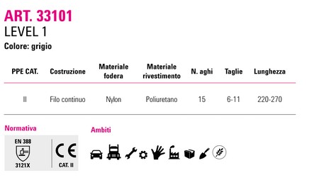 Guanto da lavoro antitaglio a maglia fibre miste (HPPE, fibra di vetro incapsulata, poliestere) rivestito in poliuretano che abbina comfort, sicurezza ed un prezzo altamente competitivo Il rivestimento in poliuretano lo rende adatto per lavorazioni di manutenzione o assemblaggio di pezzi taglienti in ambienti asciutti e/o leggermente umidi Consigliato per utilizzo nei settori: automobilistico, trasporti, meccanico, manutenzione, industria, logistica e magazzino, edilizia e agroalimentare La linea LEVEL 1 abbina un’eccellente livello di protezione ad un costo estremamente competitivo ed è stata studiata per fornire uno dei migliori rapporti qualità-prezzo del mercato Resistenza al taglio 5 (D) Ottima sensibilità Dita areate Polso elasticizzato Colore: grigio Taglie 9 e 10 Confezionamento: pacchetto da 12 paia CE Cat II - EN 388:2016 4543D A richiesta fornibili anche le taglie 6, 7, 8 e 11 Articolo Tipo Colore 33-105 Dita Areate Polso Elasticizzito Resistenza al Taglio 5 (D) Grigio