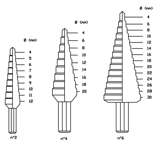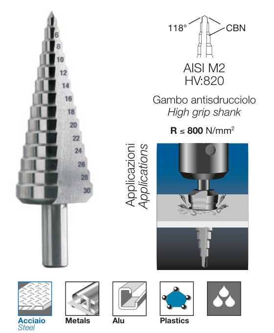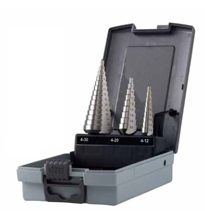 Assortimento di frese coniche a gradino con taglienti elicoidali ad alto rendimento in cassetta di ABS antiurto Composto da 3 frese Gr.2 (4-12 mm progressione 1 mm), Gr.4 (4-20 mm progressione 2 mm) e Gr.6 (4-30 mm progressione 2 mm) Linea Krino Industrial Utensili conici a gradino in HSS-G per allargare fori preesistenti nella lamiera e nella plastica Grazie al tagliente elicoidale garantiscono un altissimo rendimento con minore sforzo di taglio E' sufficiente esercitare solo una lieve pressione durante il taglio perchè l’elicoide è autoalimentante grazie alla componente assiale della forza di taglio Gambo antisdrucciolo R ≤ 800 N/mm2
