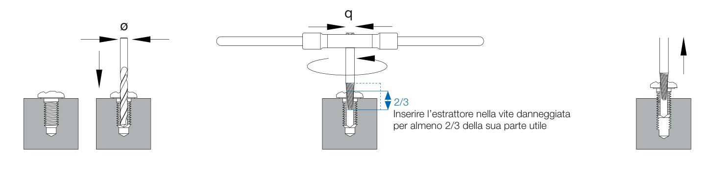 Estrattore per viti e prigionieri rotti In acciaio al Cromo Vanadio Per estrarre viti e prigionieri danneggiati o senza gesta Filettatura sinistra automordente Attacco quadro per portautensili Grandezza 4 Utilizzabile per viti e prigionieri da M12 a M14 Lunghezza totale mm 71 Diametro punta preforo mm 6.5 Coppia massima applicabile Nm 70