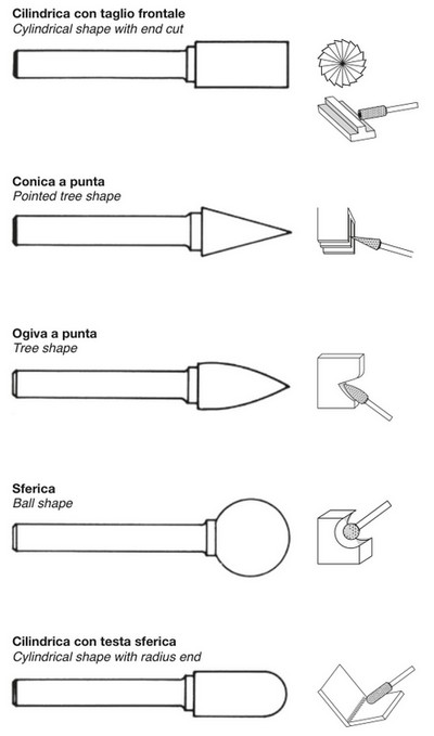 Assortimento di frese rotative Hss in cassetta di ABS antiurto Composto da 5 frese di forma diversa Ø 10 mm taglio bastardo Z2 e 5 frese di forma diversa Ø 10 mm taglio mezzodolce Z3 Le forme delle frese presenti nell'assortimento sono: cilindrica con taglio frontale, conica a punta, ogiva a punta, sferica e clindrica con testa sferica Linea Krino Industrial Testa in acciaio super rapido HSS Taglio bastardo Z2 indicato per leghe leggere, rame, ottone, bronzo, acciaio dolce - Velocità consigliata: 220÷250 m/min Taglio mezzo dolce Z3 indicato per ghisa e acciai in genere - Velocità consigliata 80÷220 m/min Lunghezza totale mm 70 (sferica mm 54) Lunghezza frese mm 30 (sferica mm 9) Attacco cilindrico Ø 6 mm
