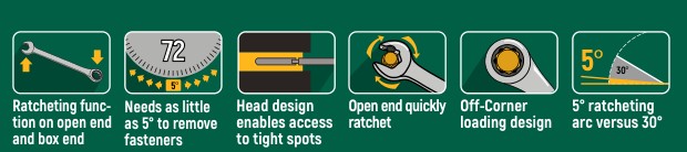 Set di 8 chiavi combinate a Cricchetto e Recupero da mm 8 a mm 19 Innovativa funzione a cricchetto su entrambe le estremità (una poligonale chiusa e una a forchetta) per aumentare velocità e produttività Finitura cromata brillante e completamente lucida che si pulisce facilmente e resiste alla corrosione, oltre ad aumentare la vita della chiave anche in caso di utilizzi prolungati e intensivi In acciaio legato al cromo vanadio (Cr-V) per resistenza e durata eccezionali Il design elegante della testa consente l'accesso a punti ristretti in cui un cricchetto non si adatta L'estremità a forchetta blocca rapidamente dadi e bulloni senza rimuovere la chiave dal dispositivo di fissaggio Grazie al sistema Surface Drive queste chiavi forniscono una presa migliore, riducendo l'arrotondamento degli elementi di fissaggio Misure: mm 8, 10, 12, 13, 14, 15, 17, 19 Conformi ASME B107.100