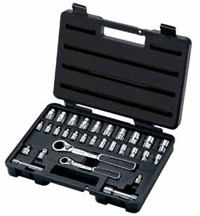 Assortimento di chiavi a bussola in pollici ed accessori con attacco quadro 3/8" Composto da bussole esagonali in pollici standard e lunghe, cricchetto, inserti ed accessori In acciaio al Cromo Vanadio Esecuzione satinata Cricchetto reversibile ergonomico Cassetta brevettata di plastica dura con piedini di appoggio in gomma antisdrucciolo ed apertura a scatto Completo di 35 pezzi Dimensioni: Mm 369x198x62 Peso: Kg 2.20 Composizione: 10 bussole standard in pollici 5/16", 3/8", 7/16", 1/2", 9/16", 5/8", 11/16", 3/4", 13/16", 7/8" 6 bussole lunghe in pollici 3/8", 7/16", 1/2", 9/16", 11/16", 3/4" 2 bussole per candele mm 16, 21 1 cricchetto reversibile 1 giunto universale 2 prolunghe mm 100, 150 1 bussola portainserti 1 raccordo di maggiorazione 3/8-1/2 2 inserti a taglio mm 4, 5.5 2 inserti Phillips Ph 1, 2 2 inserti Pozidriv Pz 1, 2 2 inserti esagonali mm 5, 6 3 inserti torx Tx 10, 15, 20