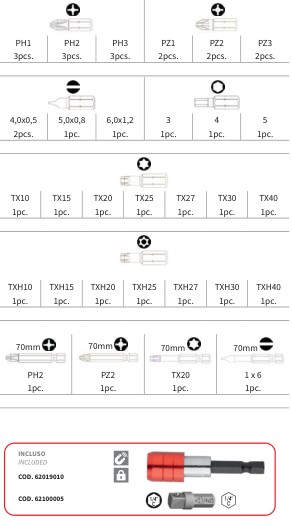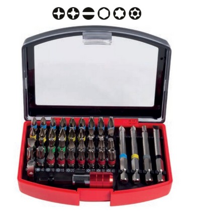 Assortimento di inserti per avvitatori a taglio, croce, pozidriv, torx, torx con foro e a brugola versione standard e lunga Composto da 71 pezzi Attacco esagonale 1/4" (mm 6,3) Lunghezza inserti mm 25 e mm 90 Composizione: 12 inserti a croce Phillips PH1 (3 pz), PH2 (6 pz) e PH3 (3 pz), 12 inserti a croce Pozidriv PZ1 (3 pz), PZ2 (6 pz) e PZ3 (3 pz), 6 inserti a taglio mm 0,6x4,0 (3 pz) e 1,2x6,0 (3 pz), 9 inserti maschio esagonale mm 4 (3 pz), 5 (3 pz) e 6 (3 pz), 15 inserti torx TX10 (3 pz), TX15 (2 pz), TX20 (2 pz), TX25 (2 pz), TX27 (2 pz), TX30 (2 pz) e TX40 (2 pz), 6 inserti torx con foro TXH10, TXH15, TXH20, TXH25, TXH30 e TXH40, 3 inserti a croce Phillips lunghi PH1, PH2 e PH3, 2 inserti a croce Pozidriv lunghi PZ1 e PZ2, 2 inserti torx lunghi TX25 e TX30, 2 inserti a taglio lunghi mm 0,5x4 e 1x6, un attacco portainserti magnetico a sgancio rapido e un attacco portainserti magnetico standard Custodia di plastica Inserti COLOUR RING con anello colorato per una migliore identificazione Inserti in acciaio di altà qualità al Cromo - Molibdeno - Vanadio temprato a cuore Temperatura di rinvenimento calibrata per dare la durezza ottimale Lavorazioni meccaniche eseguite con moderne macchine a CN di elevata affidabilità per conferire alle geometrie dell’inserto la precisione necessaria al miglior accoppiamento con la vite La fosfatazione allo zinco come rivestimento superficiale conferisce a questa linea di prodotto un’ottima resistenza all’ossidazione Grazie all’ottimo equilibrio tra durezza e tenacità, gli inserti ESSENTIAL non presentano rischi di rotture precoci e pericolose