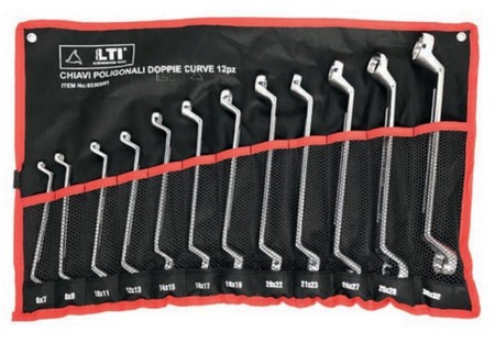 Assortimento di 12 chiavi fisse a forchetta doppie da mm 6 a mm 32 In acciaio al Cromo Vanadio Esecuzione cromata satinata Misure mm: 6x7, 8x9, 10x11, 12x13, 14x15, 16x17, 18x19, 20x22, 21x23, 24x27, 25x28, 30x32 In resistente busta di nylon doppio strato richiudibile con fori per fissaggio al muro Dimensioni mm 445x335