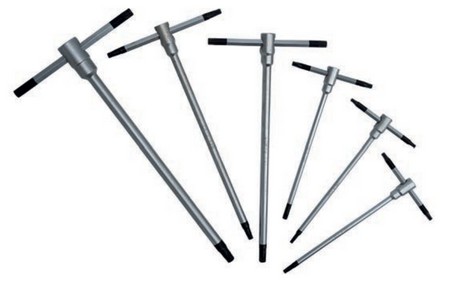 Assortimento 6 chiavi a "T" da mm 2.5 a mm 8 Tre estremità maschio esagonale a brugola In acciaio al Cromo Vanadio Teste esagonali brunite e temperate Asta di manovra a T scorrevole Misure mm: 2.5, 3, 4, 5, 6, 8 Fornita in scatola di cartone