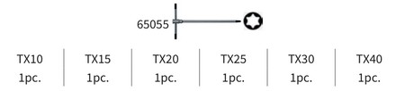 Assortimento di 6 chiavi maschio torx piegate a 90° da Tx 10 a Tx 40 Linea Rexta Ergofort Lame in acciaio speciale al silicio molibdeno tipo SVCM resistenti alla torsione Finitura microsatinata con testa brunite e temperata Impugnatura di manovra a T ergonomica bimateriale con foro di aggancio Codici e simboli identificativi di taglio e modello riportati sull'impugnatura Composizione: 6 chiavi maschio torx con impugnatura di manovra Tx 10, 15, 20, 25, 30, 40