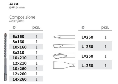 Assortimento di punte per muro rotobattenti per forare ad alto rendimento tutti i materiali edili In astuccio di plastica Composto da 7 punte Ø 4, 5, 6, 8, 9, 10, 12 mm Punte elicoidali con codolo cilindrico a 4 taglienti e 4 eliche Placchetta integrale a 4 taglienti in metallo duro HVA 1650 resistente alla forte percussione, brasatura con lega saldante a 1100°C 4 eliche con corpo fresato con scanalatura a “L” ad alta evacuazione Brasatura con lega saldante a 1100° C La placchetta in metallo duro monoblocco a 4 taglienti garantisce una grande capacità di taglio, un’ottima precisione di foratura e fori perfettamente circolari L’asportazione dei detriti è assicurata dalla combinazione delle 4 eliche e della geometria a “L” dello scarico Grande rendimento di taglio in tutti i materiali edili, cemento, granito, pietre in genere, mattoni. Prestazioni migliori del 30% rispetto a una comune punta a 2 taglienti Idonee per un uso intensivo ad alto rendimento