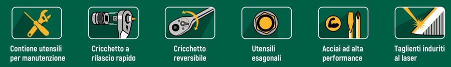 Set di 7 chiavi combinate a Cricchetto e Recupero in pollici Innovativa funzione a cricchetto su entrambe le estremità (una poligonale chiusa e una a forchetta) per aumentare velocità e produttività Finitura cromata brillante e completamente lucida che si pulisce facilmente e resiste alla corrosione, oltre ad aumentare la vita della chiave anche in caso di utilizzi prolungati e intensivi In acciaio legato al cromo vanadio (Cr-V) per resistenza e durata eccezionali Il design elegante della testa consente l'accesso a punti ristretti in cui un cricchetto non si adatta L'estremità a forchetta blocca rapidamente dadi e bulloni senza rimuovere la chiave dal dispositivo di fissaggio Grazie al sistema Surface Drive queste chiavi forniscono una presa migliore, riducendo l'arrotondamento degli elementi di fissaggio Misure: 5/16", 3/8", 7/16", 1/2", 9/16", 5/8" e 3/4” Conformi ASME B107.100 Fornito completo di custodia richiudibile con fori per fissaggio a muro
