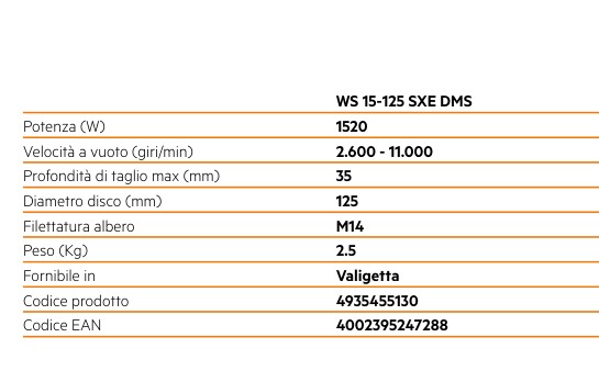 Smerigliatrice angolare elettrica con potente motore da 1300W e diametro del disco da 125 mm Nuovo potente motore da 1300 Watt con eccezionali performance Funzione Line lock out (LLO) per prevenire il riavvio automatico in caso di interruzione della corrente Velocità variabile elettronicamente per un settaggio delle velocità basse specialmente per applicazioni di finitura Velocità costante per massime performance e alta coppia, anche nelle applicazioni a bassa velocità Ingranaggi interamente in metallo, per garantire la massima durata Testa piatta degli ingranaggi in metallo, per una maggiore visibilità della lavorazione e un’ottimale profondità di taglio Ampie feritoie prevengono il surriscaldamento, anche quando occasionalmente vengono coperte con le mani Dimensioni più compatte per un uso confortevole anche in caso di utilizzo prolungato Un peso leggero per garantire maggior maneggevolezza Impugnatura addizionale con sistema AVS (antivibrazione), per rendere più confortevole il lavoro Carter di protezione regolabile senza l’utilizzo di chiavi Blocco dell’albero Fornita con impugnatura addizionale AVS, carter regolabile senza chiavi e flangia FIXTEC Scheda completa