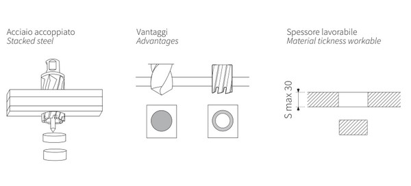 Assortimento di frese perforatrici a tazza professionali in cassetta di ABS antiurto Composto da 8 frese Ø mm 16, 18, 20, 22, 25, 30, 32, 35 Linea Krino Professional Frese perforatrici a tazza in HSS-G interamente rettificate per forare lamiere in acciaio, ferro, leghe leggere, tutti materiali metallici e plastica dura Innovativo disegno dei denti e taglio laterale: migliore scarico dei trucioli con grande rendimento del taglio R ≤ 800 N/mm2 HRC = 64 Dentatura ricavata interamente di rettifica Taglio laterale rompitruciolo Molla di espulsione del dischetto Profondità di foratura sino a 5 mm Grande rendimento, precisione di foratura nel taglio anche profondo di tutte le lamiere in acciaio, leghe leggere, materiali metallici in genere Riaffilabili
