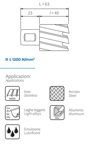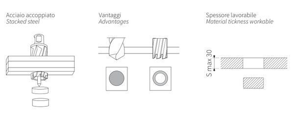 Assortimento di frese perforatrici a tazza professionali in cassetta di ABS antiurto Composto da 8 frese Ø mm 16, 18, 20, 22, 25, 30, 32, 35 Linea Krino Professional Frese perforatrici a tazza in HSS-G interamente rettificate per forare lamiere in acciaio, ferro, leghe leggere, tutti materiali metallici e plastica dura Innovativo disegno dei denti e taglio laterale: migliore scarico dei trucioli con grande rendimento del taglio R ≤ 800 N/mm2 HRC = 64 Dentatura ricavata interamente di rettifica Taglio laterale rompitruciolo Molla di espulsione del dischetto Profondità di foratura sino a 5 mm Grande rendimento, precisione di foratura nel taglio anche profondo di tutte le lamiere in acciaio, leghe leggere, materiali metallici in genere Riaffilabili
