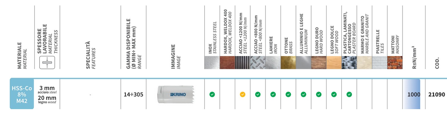 Assortimento di frese perforatrici a tazza professionali in cassetta di ABS antiurto Composto da 8 frese Ø mm 16, 18, 20, 22, 25, 30, 32, 35 Linea Krino Professional Frese perforatrici a tazza in HSS-G interamente rettificate per forare lamiere in acciaio, ferro, leghe leggere, tutti materiali metallici e plastica dura Innovativo disegno dei denti e taglio laterale: migliore scarico dei trucioli con grande rendimento del taglio R ≤ 800 N/mm2 HRC = 64 Dentatura ricavata interamente di rettifica Taglio laterale rompitruciolo Molla di espulsione del dischetto Profondità di foratura sino a 5 mm Grande rendimento, precisione di foratura nel taglio anche profondo di tutte le lamiere in acciaio, leghe leggere, materiali metallici in genere Riaffilabili