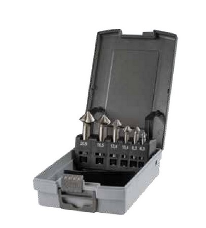 Assortimento di svasatori a 3 taglienti in cassetta di ABS antiurto Composto da 6 svasatori Ø 6.3, 8.3, 10.4, 12.4, 16.5 e 20.5 mm Linea Krino Industrial Svasatore in acciaio super rapido HSS Tipo a 3 taglienti a 90° rettificati Per svasare fori nel ferro, acciaio, leghe leggere e leghe non ferrose Attacco cilindrico