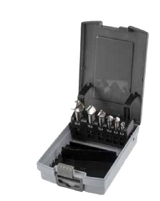 Assortimento di svasatori a 3 taglienti in cassetta di ABS antiurto Composto da 6 svasatori Ø 6.3, 8.3, 10.4, 12.4, 16.5 e 20.5 mm Linea Krino Industrial Svasatore in acciaio super rapido HSS Tipo a 3 taglienti a 90° rettificati Per svasare fori nel ferro, acciaio, leghe leggere e leghe non ferrose Attacco cilindrico