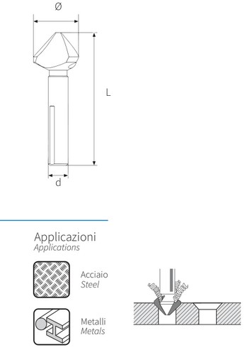 Svasatore in acciaio super rapido HSS Tipo a 3 taglienti rettificati Per svasare fori nel ferro, acciaio, leghe leggere e leghe non ferrose Conicità testa a 90°. Attacco esagonale 1/4 Indicato per uso con avvitatori elettrici e a batteria Diametro max svasatore mm 20.5 Lunghezza totale mm 48 Peso 0,023 kg