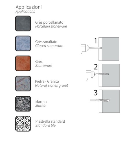 Punta diamantata a corona continua per il taglio a secco e a umido del gres porcellanato e di tutte le piastrelle Dimensione mm 10 Lunghezza mm 80 Con cera vegetale refrigerante Matrice metallica altofondente che trattiene i diamanti a grana medio fine Foratura a secco a sola rotazione Funzionamento ottimale su pareti verticali (ottimizzato il sistema di refrigerazione interna) La carota funge da tappo-dosatore per il refrigerante L'utilizzo con refrigerazione ad acqua allunga la vita della punta Adatta per forare gres porcellanato, gres smaltato, gres, marmo e piastrelle in genere Consigli di utilizzo Iniziare il taglio inclinando la fresa di 30° per agevolare la centratura Portarsi gradualmente in posizione verticale Usare una velocità di taglio di tra 1000 e 3000 giri/minuto in funzione del diametro decrescente della fresa Durante il taglio applicare un lieve movimento circolare per agevolare l'evacuazione dei detriti Invertendo periodicamente il senso di rotazione della fresa, si ravvivano i diamanti e si allunga la durata dell'utensile Utilizzando trapani elettrici e raffreddamento ad acqua, dotarsi di dispositivo PRCD Nel caso si voglia inserire un tassello, terminato il taglio nel gres continuare con una punta per muro tradizionale a rotopercussione