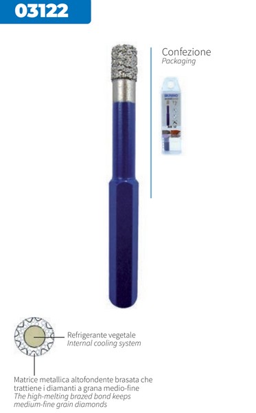 Punta diamantata a corona continua per il taglio a secco e a umido del gres porcellanato e di tutte le piastrelle Dimensione mm 12 Lunghezza mm 80 Con cera vegetale refrigerante Matrice metallica altofondente che trattiene i diamanti a grana medio fine Foratura a secco a sola rotazione Funzionamento ottimale su pareti verticali (ottimizzato il sistema di refrigerazione interna) La carota funge da tappo-dosatore per il refrigerante L'utilizzo con refrigerazione ad acqua allunga la vita della punta Adatta per forare gres porcellanato, gres smaltato, gres, marmo e piastrelle in genere Consigli di utilizzo Iniziare il taglio inclinando la fresa di 30° per agevolare la centratura Portarsi gradualmente in posizione verticale Usare una velocità di taglio di tra 1000 e 3000 giri/minuto in funzione del diametro decrescente della fresa Durante il taglio applicare un lieve movimento circolare per agevolare l'evacuazione dei detriti Invertendo periodicamente il senso di rotazione della fresa, si ravvivano i diamanti e si allunga la durata dell'utensile Utilizzando trapani elettrici e raffreddamento ad acqua, dotarsi di dispositivo PRCD Nel caso si voglia inserire un tassello, terminato il taglio nel gres continuare con una punta per muro tradizionale a rotopercussione