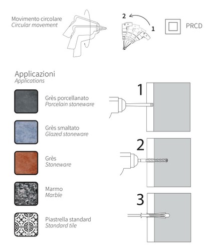 Assortimento di 3 punte diamantate a corona continua per il taglio a secco e a umido del gres porcellanato e di tutte le piastrelle Dimensioni mm 6, 8 e 10 Lunghezza mm 70 (6) - 80 (8, 10) Con cera vegetale refrigerante Matrice metallica altofondente che trattiene i diamanti a grana medio fine Foratura a secco a sola rotazione Funzionamento ottimale su pareti verticali (ottimizzato il sistema di refrigerazione interna) La carota funge da tappo-dosatore per il refrigerante L'utilizzo con refrigerazione ad acqua allunga la vita della punta Adatta per forare gres porcellanato, gres smaltato, gres, marmo e piastrelle in genere Consigli di utilizzo Iniziare il taglio inclinando la fresa di 30° per agevolare la centratura Portarsi gradualmente in posizione verticale Usare una velocità di taglio di tra 1000 e 3000 giri/minuto in funzione del diametro decrescente della fresa Durante il taglio applicare un lieve movimento circolare per agevolare l'evacuazione dei detriti Invertendo periodicamente il senso di rotazione della fresa, si ravvivano i diamanti e si allunga la durata dell'utensile Utilizzando trapani elettrici e raffreddamento ad acqua, dotarsi di dispositivo PRCD Nel caso si voglia inserire un tassello, terminato il taglio nel gres continuare con una punta per muro tradizionale a rotopercussione